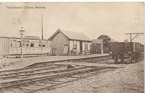 Tolleshunt D'Arcy railway station was on the Kelvedon and Tollesbury Light Railway, serving the village of Tolleshunt D'Arcy, Essex. The station was 6 miles 52 chains (10.70 km) from Kelvedon Low Level railway station.[1]