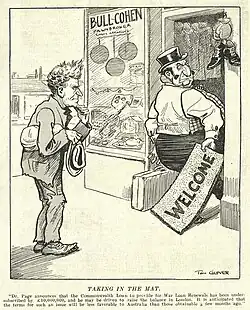 The political demise of Billy Hughes and the ascendancy of Stanley Bruce was represented as a tragedy for Australian cartoonists, as depicted in Glover's cartoon in The Bulletin of 8 February 1923.[20] Hughes' physical characteristics had been considered to be "God's gift to cartoonists". When Bruce became Prime Minister, according to a satirical article in Sydney's Daily Pictorial, "all over Australia the cartoonists sat dumbly biting their pencils, trying to figure out what they could do with the regular polished countenance of Stanley Melbourne Bruce". It was Glover that "leapt, pencil in hand, into the breach". The Bulletin artist solved the problem by representing him as "a blase, supercilious, spatted figure [who] strutted with a grand air of dignified aloofness across the boards that [Hughes] had vacated".[21] In December 1926 it was reported that the Australian Prime Minister, Stanley Bruce, had a "very fine private collection" of Australian art, including a set the original artwork of cartoons of himself by Tom Glover.[22]