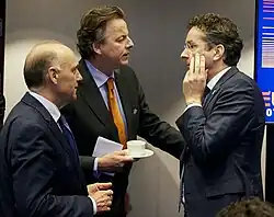 De Bruijn (left) talking to Bert Koenders (middle) and Jeroen Dijsselbloem (right) at a 2016 European conference