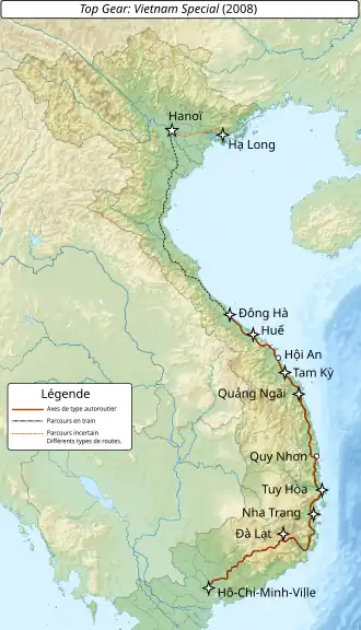 Top Gear: Vietnam Special is a special 75-minute episode for BBC motoring programme Top Gear, and was first broadcast on 28 December 2008, as part of the final episode for the twelfth series,[1] with the special repeated for UK TV channel Dave, initially in an edited, 46 minute version on 19 January 2009, but later revised to a 90-minute format following complaints by viewers. The special sees hosts, Jeremy Clarkson, Richard Hammond and James May, travelling 1,000 miles (1,600 km) across Vietnam with motorbikes, beginning from Ho Chi Minh City (Saigon), travelling north towards Hạ Long city, and finishing at a floating bar within Hạ Long Bay, a journey that had to be completed within eight days.[2][3]