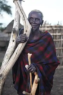 The Toposa believe in a supreme being and in ancestral spirits, who may assist in overcoming problems such as drought or epidemics of disease among their herds.[3] They believe that men originally lived with "Nakwuge" in the sky, but many slid down a rope to earth. The rope then broke, separating them from heaven.[12] As of 2000, perhaps 5% of the population could read.[1] The Toposa culture is orally transmitted through songs, dance, music, poems and folklore. The Roman Catholic Diocese of Torit has been actively proselytizing among the Toposa, with some success.[3]