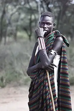 The Toposa belong to what has been called the "Karamojong cluster", which includes the Karamojong people of Uganda, the Dongiro people and Jiye people in south eastern South Sudan and south western Ethiopia, and the Turkana people of Kenya.[13] The Toposa say that they originated in the Losolia Mountains in Uganda, moving away during a severe drought that killed both people and animals.[3] A mortal quarrel between the Lwo and Tap (ancestors of the Taposa) people was thought to have upset the harmony of all life in northern Uganda, causing a great famine in 1587–1623. People were forced to move away for great distances, and those who remained were reduced to cannibalism.[14] After leaving the heartland of the original group the ancestors of the Toposa settled at Losilang for a while, then drifted north in search of grazing. At Loyoro one group, the Nyangatom or Dongiro, went east, while the Mosingo and Kor sections of the Toposa, under pressure from the Turkana, moved west and had settled in Kapoeta by 1830.[15]