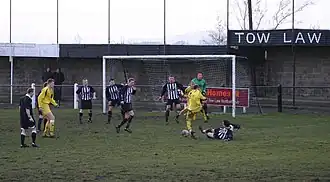 There was a football team operating in Tow Law as early as 1881, when a vicar captained the team.[1] However, the club still playing today was founded as Tow Law in 1890. The club became one of the founding teams of the Auckland and District League in 1892, and won the Durham Amateur Cup the following year. They then joined the Northern League in 1894. In 1896, they won the Durham Challenge Cup. They left the Northern League, and played in the South Durham Alliance from 1900 to 1905.[2] In 1905, the club changed its name to Tow Law Town which they have stuck with ever since.[3] The club played in the Crook and District League from 1912 until 1914. After the end of World War I in 1918, the club again played in the Auckland and District League until 1920, when they returned to the Northern League where they have played ever since. Tow Law were league winners in consecutive seasons in 1923–24 and 1924–25.[2] They were runners up in 1928–29. In the Second World War they resigned from the Northern League on 20 March 1940 and their record of the season was deleted. They rejoined the league in 1945 on its resumption after the War.[4]