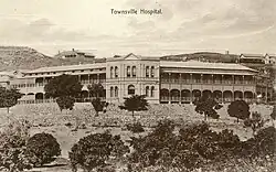 There have been three general hospitals in Townsville over the city's 150-year history. The First Townsville Hospital was established in 1882 in North Ward.[25] The two story brick building accommodated 70 patients. When Cyclone Leonta struck Townsville in May 1903, it caused extensive local damage and the hospital partially collapsed.[26] The Second Townsville General Hospital opened in North Ward on 21 April 1951.[26] The old Townsville General Hospital psychiatric service was the focus of intense scrutiny in the 1980s after it was revealed 65 people had died in the psychiatric ward.[27] The deaths and subsequent inquest gave rise to the Burden Inquiry, Report of the National Inquiry into the Human Rights of People with Mental Illness 1990. The North Ward hospital could not expand any further due to its urban location and was regularly reaching absolute capacity. However the heritage-listed hospital buildings, with their landmark white art deco appearance, enviable location, and water views, were retained and were turned into exclusive apartments.[28]