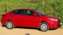In India, the Yaris sedan was launched during the 14th Auto Expo in February 2018 and marketed from May of the same year. It was badged as the Yaris, and came with a 1.5-litre petrol engine that produces 106 hp. The car was available in J, G, V and VX trim levels. All trim levels are available with choice of either a 6-speed manual transmission or CVT. Rear disc brakes are standard on the V and VX. The Indian VX model came standard with electric driver seat adjustment, ceiling-mounted rear passenger AC and rear sunshade.[50] Toyota India skipped the E model grade, but the Indian G is roughly the equivalent of the Vios E in the South Asian market, while the Indian Yaris V is similarly equipped to the Vios G. In September 2021, Toyota India officially discontinued the Yaris from the Indian market. [51]