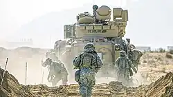 United States Army Futures Command (AFC) grew, from 12 people at headquarters in 2018 to 24,000 in 25 states and 15 countries in 2019.[60][61] More rapid modernization for conflict with near-peers is the reason for AFC.[57] AFC was to be focused on achieving clear overmatch[62] in six areas — long-range precision fires,[63][64] next-generation combat vehicle, future vertical lift platforms, a mobile & expeditionary Army network,[65][66] air & missile defense capabilities, and soldier lethality[67] (i.e. artillery, armor, aviation, signal, air defense artillery, and infantry).