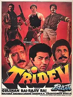 Tridev (transl. Trinity) is a 1989 Indian action thriller film directed and co-written by Rajiv Rai.[2][3][4] It stars Naseeruddin Shah, Sunny Deol, Jackie Shroff, Madhuri Dixit, Sangeeta Bijlani, Sonam, Anupam Kher and Amrish Puri.[5]