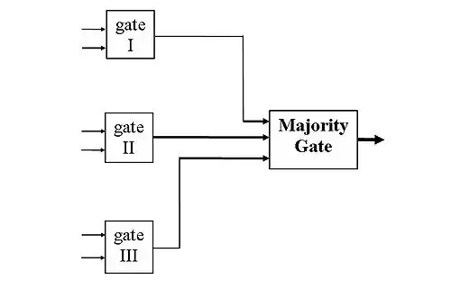 Assuming the Boolean function computed by the three identical logic gates has value 1, then: (a) if no circuit has failed, all three circuits produce an output of value 1, and the majority gate output has value 1. (b) if one circuit fails and produces an output of 0, while the other two are working correctly and produce an output of 1, the majority gate output is 1, i.e., it still has the correct value. And similarly for the case when the Boolean function computed by the three identical circuits has value 0. Thus, the majority gate output is guaranteed to be correct as long as no more than one of the three identical logic circuits has failed.[7]