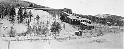 As early as 1877, gold was known to be inside Bald Mountain and Green Mountain, located in the Trojan area. By 1900, many claims had been sorted out into only a few, and by 1911, the Trojan Mining Company held the majority of them. In 1928, the Trojan Mining Company was bought out by the Bald Mountain Mining Company. However, by the 1950s, the ore in the Trojan mines was only being sold for $6 per ton, which did not provide enough of a profit to keep the mines in operation. Steel and powder, which were required to run the mines, increased in price, but gold remained $35 an ounce, which it had been since 1934. In 1959, all operations shut down and every mining building, including the miners' homes, closed. In 1960, the mine's rails were removed. For a time, the town tried to revive itself by providing for skiers at Terry Peak, but they were not successful. In 1983, the open pit Wharf Mine was established in the Trojan area and continues in operation to this day.[2] It has grown to the extent to have completely enveloped the old townsite and Bald Mountain Mill so that there are no historic remains at those sites.