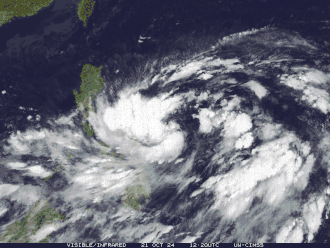 Early the next day, satellite imagery revealed that the depression was exposed, featuring elongated circulation and convective bands wrapping around the center.[9] At 18:00 UTC that day, the JMA upgraded the system to a tropical storm and named it Trami,[10] with spiral bands of deep convection starting to wrap around the low-level circulation.[11] Trami was moving westward along the southern edge of a mid-level subtropical high, developing spiral bands of deep convection that wrapped around a partly exposed low-level circulation center just east of Luzon Island,[12] while its deep convective banding was displaced over the southwestern quadrant due to northeasterly vertical wind shear.[13] As Trami approached Luzon, its central dense overcast (CDO) became sheared and displaced from its central circulation,[14] featuring moderate upper-level outflow and a partially exposed circulation center located to the northeast of the primary broad central convection.[15] At around 06:00 UTC on October 23, the JMA reported that Trami had intensified into a severe tropical storm as it was moving west-northwestward along the southwestern edge of a mid-level subtropical high,[16] with deep convection developing in the southwestern quadrant of a broad, partially exposed low-level circulation.[17] At 12:30 AM PHT on October 24 (16:30 UTC on October 23), the storm made landfall in Divilacan, Isabela,[18][19] where it exhibited a circular CDO characterized by fragmented convection as it moved across central Luzon.[20] The following day, Trami emerged over the coastal waters of southern Ilocos Sur,[21] with surface observations and radar data revealing that the storm had undergone a lee-side jump,[22] leaving the remnants of a circulation center over Northern Luzon while mid-level rotation shifted slowly westward into the eastern South China Sea;[23] later, satellite imagery showed a consolidating CDO, indicating a well-defined circulation with most of the deep convection situated to the south.[24]