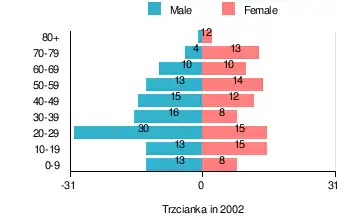 According to the 2002 Poland census, there were 212 people residing in Trzcianka village, of whom 54.2% were male and 45.8% were female. In the village, the population was spread out, with 18.4% under the age of 18, 42.9% from 18 to 44, 21.2% from 45 to 64, and 17.5% who were 65 years of age or older.[2]