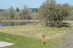 Wapato Lake Unit is located about 15 miles (24 km) to the west of the main refuge, near the city of Gaston along Oregon Route 47 in Washington and Yamhill counties.[16][37] The area was once the site of Wapato Lake, whose soil held an organic-rich peat that sustained a shrub swamp ecosystem. The wapato plant (Sagittaria latifolia) grew in the upper marsh of the Wapato Lake Basin and was harvested by Native Americans.[33][38] In 1892, attempts began to drain the 800 acres (320 ha) lake to increase farmland,[16][39] with the Wapato Improvement District completing the effort in the 1930s.[40] Valley forests, prairies, and wetlands encompass the region today,[33] including two small streams, Ayers and Wapato creeks.[41]