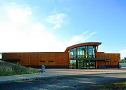 The 6,300-square-foot (590 m2) Wildlife Center was designed to give basic information and encourage visitors to then explore the wildlife in their natural habitats.[21][31] The building is sienna in color and was built with a flat roof that has gravel on top to provide nesting habitat for birds, one of the features designed to be environmentally friendly.[31][34] Built at a cost of $4.6 million, the Wildlife Center also has a large arced skylight and atrium in the center to provide much natural light.[31] Builders used local wood in the Wildlife Center, which has large, exposed beams. The center and headquarters are adjacent to each other off Oregon Route 99W on a knoll above a seasonal pond.[20]