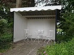 The original purpose of the hut was that the patient could recover by resting in solitude. The patient was supposed to stay in the hut night and day, and this stay could take months or even years.[2] The huts were acquired for other purposes too, like a summerhouse or gazebo. At least the Irish playwright George Bernard Shaw and sexologist Havelock Ellis are known to have owned a revolving "writing hut".[1] Until the late 1940s tuberculosis patients were often put in tuberculosis huts.[6] With the introduction of effective medication in the 1950s the huts lost their original purpose and started to serve new ones.[2][7] In 1982 the collection of the Netherlands Open Air Museum was expanded with a tuberculosis hut, as a gift from the National Cross Association.[3] One of the open-air TB huts of Montcalm Sanitarium in Manitou Springs, Colorado was donated to the Miramont Castle museum in 1998.[8] Rijksmuseum Boerhaave in Leiden (The Netherlands) owns a hut since 2011 and Open Air Museum Het Hoogeland in Warffum (The Netherlands) owns one since April 2016.[2]