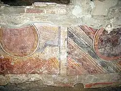 The archaeological research shows that some public edifices and the palaces were also richly decorated with mural paintings[11] but unfortunately the few remaining fragments are not enough for the themes to be determined. The fragments of richly dressed men were discovered in the throne hall[12] which suggests that probably the hall was decorated with the depictions of the Bulgarian Emperors and Empresses.