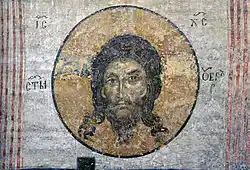 On the first layer were depicted saints who were usually stepped on a high painted plinth, which is one of the characteristic features of the School. Its lines imitated the panel plates of coloured marble. The selection of saints depended on the preferences of the ktitors or on the general theme of the frescoes. Typical feature of the Tarnovo Artistic School are the numerous depictions of warrior-saints. For instance, in the Boyana Church there are ten warrior-saints. Widely spread was the image St Demetrius of Salonica, the patron saint of the Asen dynasty, who was particularly popular in Bulgaria in 13th and 14th centuries. The ktitors were depicted in the narthex of the churches. Portraits of many noble Bulgarians from the Middle Ages have survived throughout the centuries due to that practice. In the Boyana Church are preserved the images of Emperor Constantine Tikh Asen, his wife Irina, sebastokrator Kaloyan and his wife Desislava.[5] There is a beautiful fresco of Emperor Ivan Alexander in the ossuary of the Bachkovo Monastery and in the church of Dolna Kamenitsa there are eleven images: despot Michael (son of Michael Shishman) his wife an unknown noble holding a model of the church; his wife and children and two clerics. Images of warrior saints and ktitors were common in the preserved detailed mural paintings on the foundations of the churches in Trapezitsa.[6] These paintings are featured with mild tones and a sense of realism in the rendered portraits and cloths. One of the churches in Trapeztisa was covered with mosaics.[7] The palace church also had some mosaic decoration.[8]