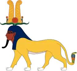 A depiction of Tutu as a lion with a human head, wearing the Double Feather crown, the Solar Disk and Ram Horns.
