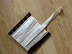 Twill tape or twilled tape is a flat herringbone twill-woven fabric tape or ribbon[1] of cotton, linen, polyester, or wool. It may be used in sewing and tailoring to reinforce seams, make casings, bind edges, and make sturdy ties for closing garments[1] (for example, on hospital gowns). Twill tape is also used in theatre to tie curtains, cable and scenery to various objects, or to tie cable coils so that they do not unroll.