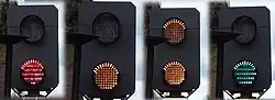The concept had a renaissance in the 2000s with the advent of LEDs which allow the same aperture to be used to display multiple colours, while eliminating moving parts that could fail on searchlight signals. Similar to the earlier searchlight signals, these LED signals use one aperture to display red, yellow, and green aspects, and a second aperture to display the top yellow of a double yellow where required in four-aspect signalling areas.[12][13]