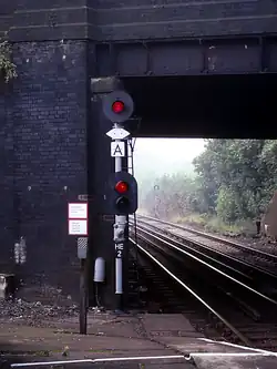 A SPAD indicator[36] is a separate indicator which may be positioned after a main signal where there is a likelihood of a serious collision at a junction if a SPAD (signal passed at danger) occurs at the main signal. They are normally unlit but following a SPAD they display a steady red light between two flashing red lights arranged vertically.[37] Any driver who sees a SPAD indicator illuminated must stop their train immediately and subsequently contact the signaller for further instructions, even if they can see that the signal pertaining to their line is showing a proceed aspect. SPAD indicators are mounted against a blue backplate or surround to prevent confusion with a failed signal, as SPAD indicators are unlit.[37] Initial testing of SPAD indicators occurred in 1994, with the current design being installed in 1996.[37] Advances in train protection systems, especially decision to install Train Protection & Warning System in response to The Railway Safety Regulations 1999, has rendered the SPAD indicator largely obsolete.[37][38]