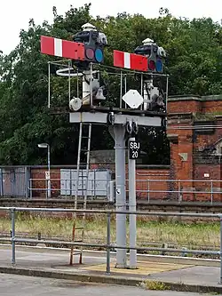 A British lower-quadrant semaphore stop signal with subsidiary arm below