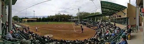 The softball stadium is directly south of the baseball stadium and has 800 seats, plus space for over 800 additional fans on the berms surrounding the field. It also hosts the USF Softball Hall of Fame, which is separate from the USF Athletic Hall of Fame.[17] Softball is USF's only sport with the distinction of its own hall of fame. The playing field is 190 feet in left and right field, 210 feet in left-center and right-center, and 230 feet in center.