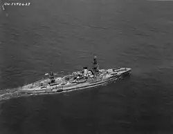 Arkansas was anchored in Casco Bay, Maine, on 7 December 1941, when Japan attacked Pearl Harbor and brought the United States into the war. A week later, she steamed to Hvalfjordur, Iceland, and returned to Boston on 24 January 1942. She conducted training maneuvers in Casco Bay, to prepare her crew for convoy escort duties.[2] On 6 March, she arrived at Norfolk, to begin overhaul. The secondary battery was reduced to six 5-inch/51 cal guns. Also, 36 40 mm Bofors anti-aircraft (AA) guns (in quadruple mounts) and 26 20 mm Oerlikon AA guns were added, the experience at Pearl Harbor having made the US Navy aware of the need for increased light AA armament. The 3-inch/50 caliber gun armament was also increased from 8 guns to 10.[19] Work lasted until 2 July, after which time Arkansas conducted a shakedown cruise in Chesapeake Bay; she then proceeded to New York, arriving on 27 July. There, she became the flagship of Task Force 38 (TF 38), the escort for a convoy of twelve transports bound for Scotland. The convoy arrived in Greenock, on 17 August, and Arkansas returned to New York on 4 September.[2]