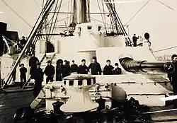 As-built armament included two 8-inch (203 mm)/30 caliber Mark 1 guns,[3] six 6-inch (152 mm)/30 caliber Mark 2 guns,[4] two 6-pounder (57 mm (2.24 in)) rapid fire guns, two 3-pounder (47 mm (1.85 in)) Hotchkiss revolving cannon, two 1-pounder (37 mm (1.46 in)) Hotchkiss revolving cannon, and two .45 caliber (11.4 mm) Gatling guns.[2] The 8-inch guns were initially in open barbettes with gun shields added later.[5]