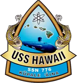 USS Hawaii (SSN-776), a Virginia-class submarine, is the first commissioned warship of the United States Navy to be named for the 50th state. (A previous large cruiser, or battlecruiser, USS Hawaii (CB-3) was launched, but never commissioned, and was named after the Territory of Hawaii.) The building contract was awarded to the Electric Boat Division of General Dynamics Corporation in Groton, Connecticut on 30 September 1998 and her keel was laid down on 27 August 2004. She was christened on 17 June 2006 by her sponsor, Governor Linda Lingle of Hawaii. Electric Boat delivered Hawaii to the US Navy on 22 December 2006, ahead of schedule.[7] She was commissioned on 5 May 2007.[8] In July 2009, she changed home port from Groton, CT (Submarine Group Two, Submarine Squadron Two) to Pearl Harbor, HI (Submarine Squadron One).[9]