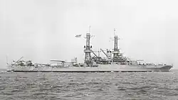 Idaho was laid down on 20 January 1915 at the New York Shipbuilding Corporation in Camden, New Jersey. She was launched on 30 June 1917, and after fitting-out work ended, the new battleship was commissioned into the fleet on 24 March 1919.[1] Shortly afterward, the ship began her shakedown cruise, departing on 13 April for Guantánamo Bay, Cuba, before returning to New York. There, the President of Brazil, Epitácio Pessoa, boarded the ship to return to Brazil. The trip began on 6 July; Idaho reached Rio de Janeiro on 17 July, where Pessoa left the ship, and continued on to the Panama Canal. She steamed to Monterey, California, where she joined the Pacific Fleet in September. The fleet then conducted a series of training exercises and held a naval review on 13 September for President Woodrow Wilson. Idaho hosted the Secretary of the Navy Josephus Daniels and the Secretary of the Interior John B. Payne for a tour of Alaska, which concluded on 22 July.[8]