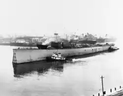 Kentucky was never completed, instead serving as a parts hulk while in the mothball fleet at the Philadelphia Naval Shipyard from about 1950 to 1958.[24] Hurricane Hazel hit the area on 15 October 1954, causing Kentucky to break free from her moorings and run aground in the Delaware River.[28] In 1956, Kentucky's bow was removed and used in the repair of Wisconsin, which had been damaged in a collision with the destroyer USS Eaton on 6 May 1956.[24] Congressman William Huston Natcher attempted to block the sale of the ship by objecting to the bill in August 1957.[29] Nevertheless, Kentucky was struck from the Naval Vessel Register on 9 June 1958 and her incomplete hulk was sold for scrapping to Boston Metals Company of Baltimore, Maryland on 31 October for $1,176,666.[19][30] She was towed to their shipyard in Baltimore in February 1959.[27]