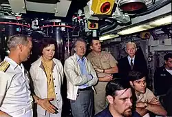 USS Los Angeles (SSN-688), lead ship of her class of submarines, was the fourth ship of the United States Navy to be named for Los Angeles, California. The contract to build her was awarded to Newport News Shipbuilding and Dry Dock Company in Newport News, Virginia on 8 January 1971 and her keel was laid down on 8 January 1972. She was launched on 6 April 1974 sponsored by Anne Armstrong, and commissioned on 13 November 1976. She hosted President Jimmy Carter and the First Lady on 27 May 1977 for an at-sea demonstration of her capabilities.[2] In 2007 she was the oldest submarine in active service with the United States Navy.[3] The Navy decommissioned Los Angeles on 23 January 2010, in the Port of Los Angeles, Los Angeles, California, her namesake city.[4]