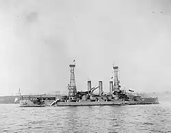 After returning from the last operation, Louisiana was reduced to reserve status at Norfolk and employed as a training ship for midshipmen and naval militia units. Following the United States' declaration of war on Germany on 6 April 1917, Louisiana was used to train gunners and engine room personnel.[3] During this period, she was involved in a gunnery accident. During training on 1 June 1918, the crews for three of the 7-inch guns aboard the battleship New Hampshire accidentally began firing at one of the submarine chasers present; they fired several salvos before they received the order to cease fire. One of the shells struck Louisiana, killing one man and wounding several more.[9] The ship was thereafter used to examine one of Arthur Pollen's Argo Clocks, a fire control system that incorporated the first mechanical analog computer. The system was installed starting on 19 June, with work being completed by 1 July.[10]
