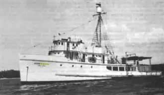In 1954, Hugh M. Smith shifted to a new focus as the FWS sought information on the largely unexplored albacore fishing grounds of the North Pacific Ocean to the north and east of Hawaii.[52] To compliment an exploratory fishing cruise US FWS John R. Manning made in the area, Hugh M. Smith conducted a 53-day hydrographic cruise — her 25th FWS cruise — in the North Pacific in early 1954.[52] She occupied 89 hydrographic stations, at each of which she took water samples for chemical analysis at 13 different depths ranging from the surface to 4,000 feet (1,219 m), took bathythermograph readings, and made plankton tows from the surface to a depth of 600 feet (183 m) to sample zooplankton.[52] She took additional bathythermograph readings in between the stations, gathering data on the subsurface temperature structure of the region.[52] She also used an underway current meter to measure surface currents.[52] It was the most thorough oceanographic study of the area ever made up to that time,[52] completing the FWS survey of the area begun by John R. Manning.[52] Hugh M. Smith returned to Pearl Harbor on 17 March 1954.[52]