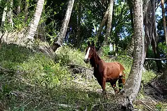 Because of the sparse vegetation, there are only a few species of native land animals on Ua Huka, mainly insects, lizards, land birds and spiders including a genus of spiders endemic to the Marquesas named after this island itself belonging to the canopy spider family (Linyphiidae). The large number of feral goats and horses that graze freely there contribute to scrub deforestation. Horses were brought from Chile to Ua Huka by Admiral du Petit-Thouars in 1842,[6] it has gained a reputation ever since as the "horse island" where it is said that there are more horses than people on the island numbering around 3,000.[7][8]