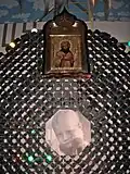 Symbolic display of road signs for the villages abandoned as a result of the disaster. To stress the tragedy of devastation, the signs are colored in black (instead of standard blue/white) and slashed with pink stripe (which designates "end of the settlement" on the actual signs). Above the signs is an authentic Khorugv from the abandoned village church.