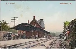 The Vermont and Massachusetts Railroad opened from the state line at East Northfield, Massachusetts/South Vernon, Vermont to Brattleboro on February 20, 1849.[2] The Vermont Valley Railroad opened between Brattleboro and Bellows Falls in 1851, completing the all-rail route between Burlington, Vermont and Springfield, Massachusetts. The three lines became part of the Central Vermont Railway (CV) in 1873.[3]: 171  The first Brattleboro station was a long single-story wooden building, no longer extant.[2]