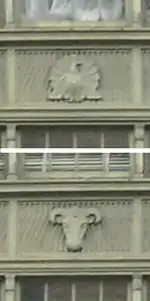 The building is arranged in seven north–south wings, connected at the ends by the Headhouse (facing Independence Avenue) and Tailhouse (facing C Street).[2] The 12th and 14th Street elevations were planned to be seen from the National Mall and so were sheathed in limestone. The C Street and Independence Avenue elevations, which are not visible from the National Mall, used brick as the primary material, with limestone and terra cotta detailing. The 14th Street elevation also features a monumental entrance with sixteen Corinthian columns. Elsewhere, relief panels between windows feature depictions of animals native to the United States by sculptor Edwin Morris.[5]