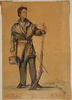 The Mounted Rangers were organized into six companies, each with a captain, a first lieutenant, a second lieutenant, a third lieutenant, five sergeants, five corporals, and 100 private rangers.[4] Henry Dodge was made a major and the commander; captains were Lemuel Ford, Benjamin V. Becks, Jesse B. Brown, Jesse Bean, Nathan Boone, and Matthew Duncan.[5] The officers and NCOs were appointed directly from civilian life. The private rangers were hardened hunters, trappers, and other outdoorsmen, who were used to a rugged life. They enlisted for one year only, and had to supply their own mounts, horse tack, weapons, equipment, and clothing, and pay for their horses' forage. As compensation they received one dollar a day in addition to their pay.[2][6]
