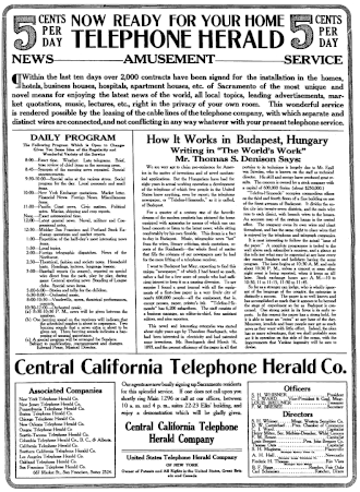10. ^ a b "Central California Telephone Herald" (advertisement), Sacramento Union, December 15, 1912, page 36.