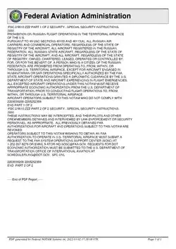 The ban went into effect at March 2, 2022, 9:00 am Eastern Standard Time (UTC−05:00).[131] The Federal Aviation Administration's official notice was sent as a NOTAM entitled "Special Security Instructions (SSI) Prohibition on Russian Flight Operations in the Territorial Airspace of the U.S." A prohibition against operating to, from, within, or through U.S. territorial airspace was applied to the following: