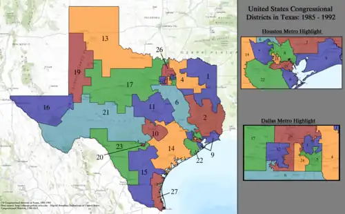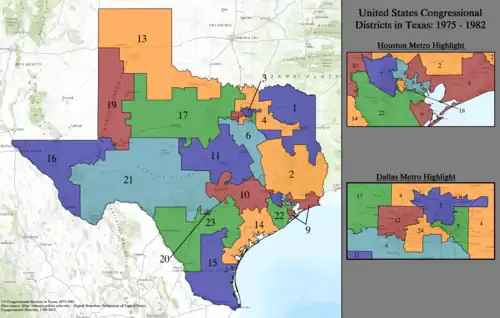 Below is a table of United States congressional district boundary maps for the State of Texas, presented chronologically.[6] All 10 redistricting events that took place in Texas in the decades between 1973 and 2013 are illustrated here.