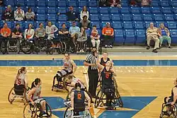 Women's team playing the Alabama Crimson Tide in the 2022 National Intercollegiate Wheelchair Basketball Tournament Women's Championship