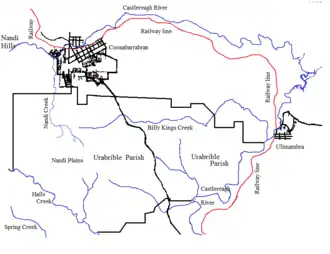 Urabrible is centered on 31°19′54″S 149°17′04″E and is just south of Coonabarabran. The parish is bounded on the east by the Castlereagh River with the village of Ulamambri. The topography is dominated by Halls Creek and the Nandi Plains.[3]
