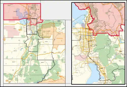 Utah's 1st congressional district serves the northern area of Utah, including the cities of Ogden, Logan, Layton, Clearfield, parts of Park City and Salt Lake City, and the northern half of the Great Salt Lake.