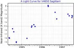 A near-infrared (K band) light curve for V4650 Sagittarii, adapted from Glass et al. (1999)[5]