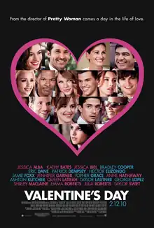 Valentine's Day is a 2010 American romantic comedy film directed by Garry Marshall. The screenplay and the story were written by Katherine Fugate, Abby Kohn, and Marc Silverstein. The film features an ensemble cast led by Jessica Alba, Kathy Bates, Jessica Biel, Bradley Cooper, Eric Dane, Patrick Dempsey, Héctor Elizondo, Jamie Foxx, Jennifer Garner, Topher Grace, Anne Hathaway, Ashton Kutcher, Queen Latifah, Taylor Lautner, George Lopez, Shirley MacLaine, Emma Roberts, Julia Roberts, and Taylor Swift in her film acting debut. It tells different love stories that occur on Valentine's Day.