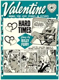 Valentine quickly became a runaway success, and by 1961 was selling 400,000 copies[4] before circulation rose to half a million.[5] The comic stayed fresh as the sixties went on by following the pop charts closely with strips inspired by songs recorded by The McGuire Sisters, Johnnie Ray, Adam Faith, Connie Francis, The Shadows, Eden Kane, Billy Fury, Pat Boone, Brenda Lee, Gerry and the Pacemakers, Cilla Black, The Overlanders, Four Tops, The Beatles, The Easybeats, The Move and many more.[1][6]