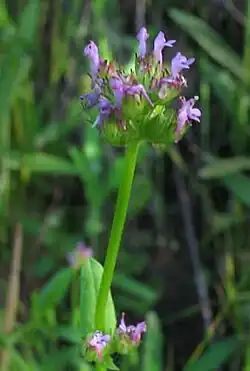 It is an annual herb growing erect to a maximum height between 50 and 80 centimeters. The widely spaced, paired and oppositely arranged leaves are oval or somewhat oblong, smooth-edged, and up to 3 centimeters long by 1 wide. The upper ones lack petioles. The inflorescence is a dense headlike cluster of flowers in shades of bright to pale pink with two darker pink dots on the lower lip. Each flower has a long, slender spur extending downward from the front of the corolla.