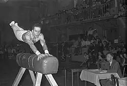 German Friedrich Ludwig Jahn popularized the vault's early forms. The apparatus itself originated as a "horse", much like the pommel horse but without the handles; it was sometimes known as the vaulting horse. The horse was set up with its long dimension perpendicular to the run for women, and parallel for men.[1] The vaulting horse was the apparatus used in the Olympics for over a century, beginning with the Men's vault in the first modern Olympics and ending with the Gymnastics at the 2000 Summer Olympics.
